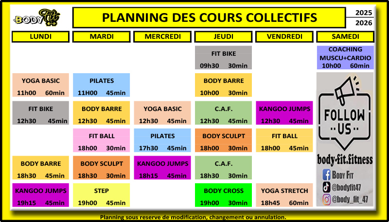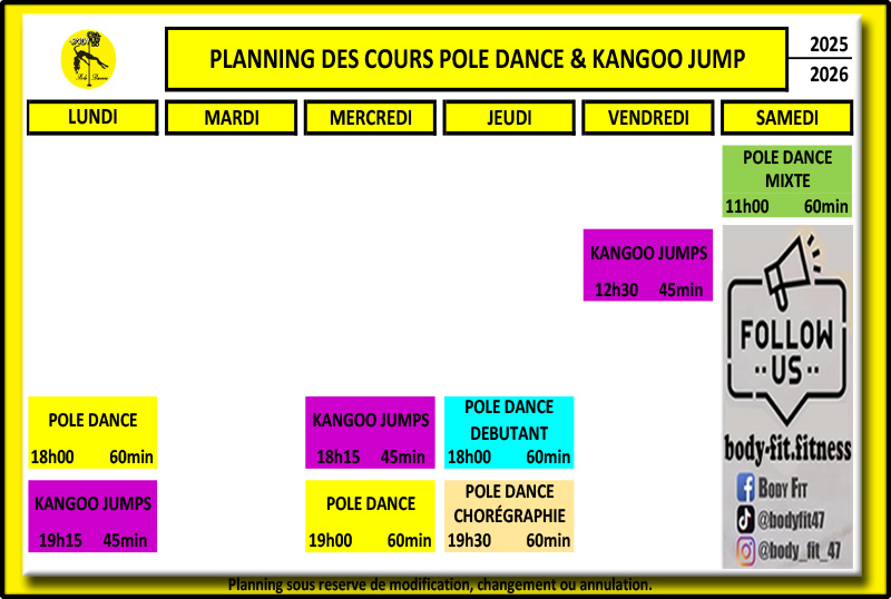 Planning des cours collectifs et Pole Dance :