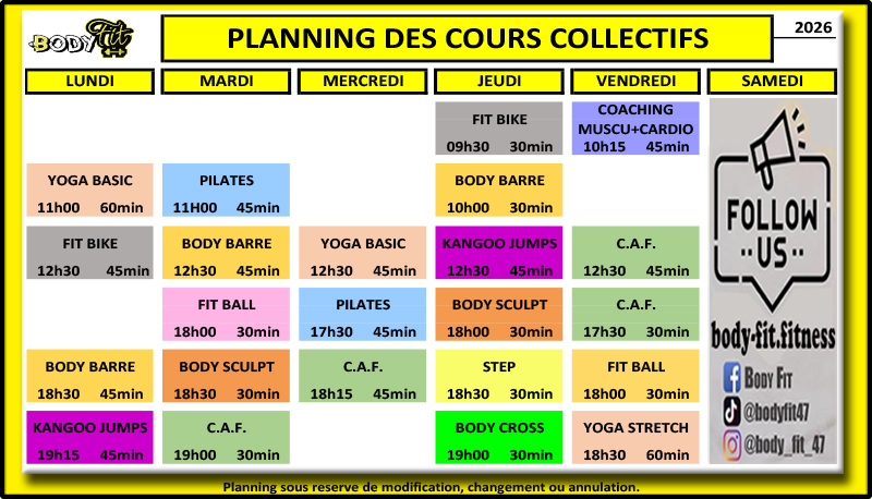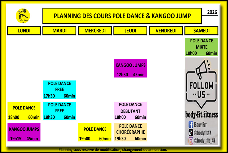 Planning des cours collectifs et Pole Dance :